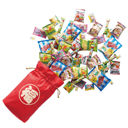 でっかい福袋に夢いっぱいのお菓子を詰めて! もらってうれしいお菓子50点セットです。