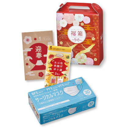 商品詳細備考 | <セット内容>BFE・PFE・VFE99%カットフィルター使用サージカルマスク30枚×1、めでたいエコな手提げポリ袋2枚入×1、迎春柄紙製水切り袋1枚×1 ※カートン割れ不可 |