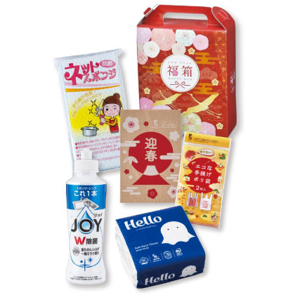 商品詳細備考 | <セット内容>P&G除菌ジョイコンパクト170ml(さわやか微香)×1、迎春柄紙製水切り袋1枚×1、めでたいエコな手提げポリ袋2枚入×1、ハローハーフサイズソフトパックティシュ180W×1、ネットスポンジ×1 ※ハローハーフサイズソフトパックティシュ180Wは2色不均等アソートになります。 ※ネットスポンジは4色不均等アソートになります。 ※カートン割れ不可 |