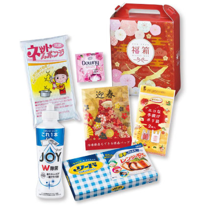 商品詳細備考 | <セット内容>P&G除菌ジョイコンパクト170ml(さわやか微香)×1、迎春柄フリーザージッパーバッグ1枚×1、めでたいエコな手提げポリ袋2枚入×1、ライオンリードクッキングペーパー小4枚×1、ダウニー×1、ネットスポンジ×1 ※ダウニーは不均等アソートになります。 ※ネットスポンジは4色不均等アソートになります。 ※カートン割れ不可 |