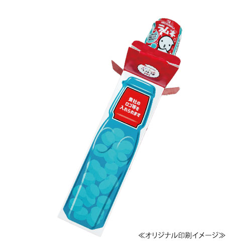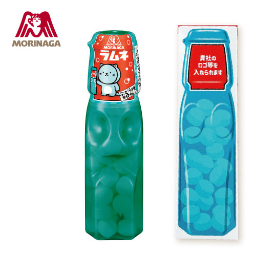 50年以上愛され続けている緑のボトルのラムネをオリジナルデザインの箱に入れてお届けします。溶ける心配がないので、夏場のイベントノベルティとしても大活躍すること間違いなし!
