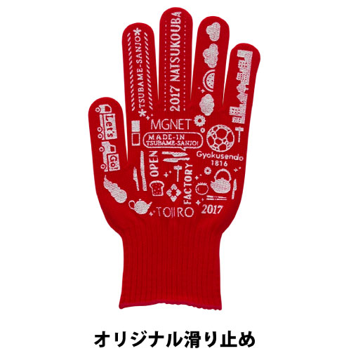 非常にカラフルな手袋で、日本で染めて編み立てています。 通常の印刷の他に、フルカラー転写、手の平にすべり止め加工、ネーム縫い付けなどのオプションもあります。